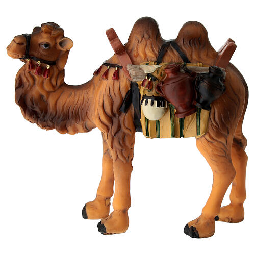 Hand-painted resin nativity figurine depicting a standing camel with pots on the sides and a basket. Dimensions of the figurine are 9.5 cm in height, 10 cm in width, and 3.3 cm in thickness. Suitable for a 9 cm high nativity scene.