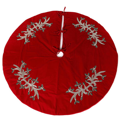 Christmas tree skirt in red velvet with hand embroidered mistletoe with pearls and rhinestones. Christmas skirt suitable for home contexts, easy application with laces.The item made: 60% polyester and 40% rayon with 100% polyester padding, diameter 1.40 cm.Do not wash in the washing machine, carry out a localized cleaning for stains. Use iron on medium heat.