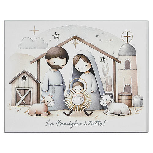 Thilia panel 15x20 cm stylized Holy Family. Rectangular decorative panel depicting a stylized Nativity scene with simplified figures and neutral tones. The image shows Joseph, Mary and the Child at the center of a stable, accompanied by animals and architectural details such as a church with a cross and a barn, composed in a balanced layout with star graphics and softly shaded clouds. The base bears the printed Italian phrase "La Famiglia è tutto" in cursive, reinforcing its symbolic and decorat...