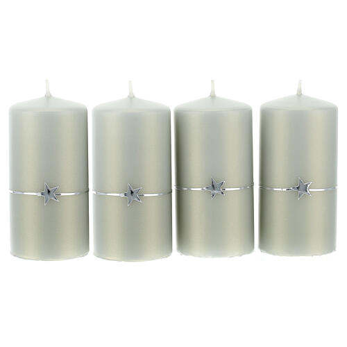 Christmas candles 4 pcs with silver gray star 100x50 mm.Silver gray Christmas candle, decorated in the center with a silver band with a star. This candle is perfect for homes/offices and can be used to make Advent wreaths.This holiday candle has a diameter of 5 cm and a height of 10 cm, and is produced in Germany by a historic wax factory.This candle is equipped with the SafeCandle protection system, which allows it to self-extinguish once exhausted without the wick bending. Thanks to this patented system, it is particularly safe and suitable for use on Advent wreaths.Pack of 4 candles gray Christmas candles.