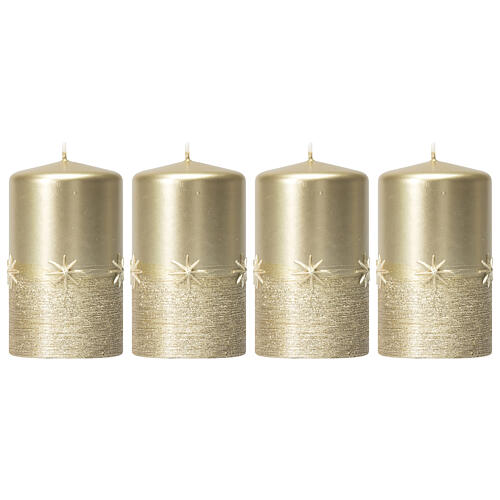 Golden candles 4 pcs Christmas stars 100x60 mm.This metallic gold Christmas candle is decorated at the base with a satin finish with stars. The candle measures 10 cm in height and 6 cm in diameter and is made in Germany. Ideal as a home decoration or placed on an Advent wreath.This candle is equipped with the SafeCandle protection system, which allows it to self-extinguish once exhausted without the wick bending. Thanks to this patented system, it is particularly safe and suitable for use on Advent wreaths.Pack of 4 gold Christmas candles.
