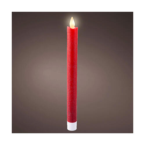 Red LED candle with warm flame effect wax, 25 cm. Made of red wax, this LED candle features a natural-looking moving flame. The crafted wax appears to melt under the warmth of the light, while the 24 cm long body is compact and pleasant to the touch. The three-dimensional flickering flame is internally illuminated by a warm white LED. Battery-operated (2 x AAA, batteries not included), you can place it wherever you desire. At the base, a lever allows you to turn it on, off, and activate the 8/16...