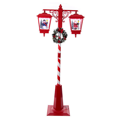 Double snowy Christmas street lamp with music lights 188x81x40 cm.Ideal Christmas decoration for decorating indoor commercial and home spaces. This red and white street lamp features two illuminated lanterns, with figures of Santa Claus and a snowman inside each. The two lanterns are equipped with a switch that activates the light, the Christmas music and the automatic snow movement. The lamppost is further decorated with a Christmas garland and decorations reminiscent of Christmas sweets. The l...