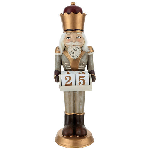General Nutcracker Statue with Calendar, 60 cm. General Nutcracker made of resin, dressed in shades of gray, enriched with golden, white, and brown details. The General has a long white beard, well-groomed mustache, and fluffy curls, wearing a majestic crown on his head. He holds two numbered cubes serving as a calendar, indicating the day of the week. Dimensions: height 59.3 cm, base 16.6 x 18.7 cm.