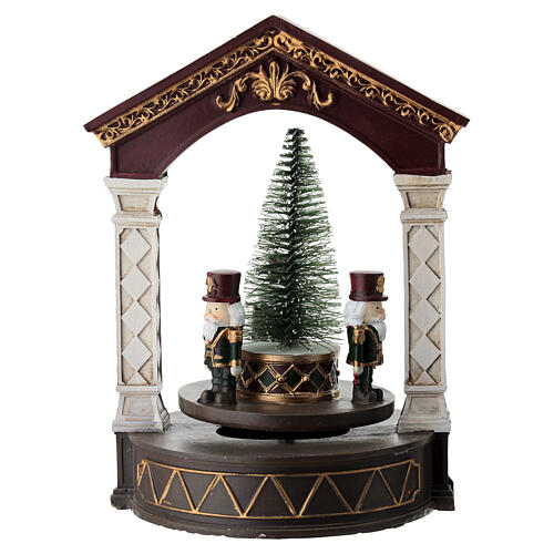 Music box with nutcracker and tree, 20x15x15 cm. Music box with nutcrackers depicting a Christmas scene in resin, hand-painted details, and golden finishes. In the center of a circular stage is a small Christmas tree, accompanied by three nutcracker soldiers, both wearing tall hats and uniforms. The entire scene is framed by an elegant arch supported by two finely decorated columns. The base features a large golden zigzag decoration adding a touch of sophistication. When activated, the music box plays the Christmas musical melody Silent Night, creating a magical and festive atmosphere. Actual dimensions: 20x13.4x14.5 cm.