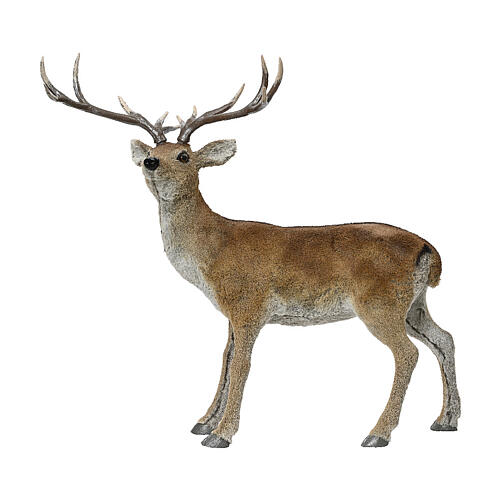 Tender deer Christmas statue 40x83x92 cm. A gentle deer with its head turned to the left, perfect for enriching shop windows, decorative corners, or seasonal displays with a tender and refined touch. The soft finish of the fur and its realistic appearance make it ideal for creating Easter or winter scenes, both in commercial and home settings. Dimensions: height 91 cm, length 40 cm, width 83 cm. A versatile element that adds sweetness and charm to any space.