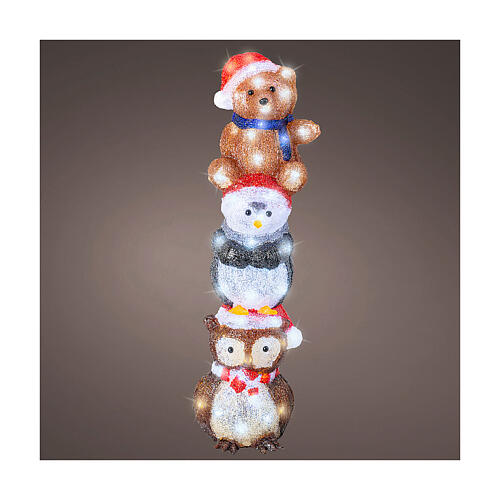 Luminous figure owl penguin bear 80 LED 20x20x60 cm internal external. Luminous acrylic Christmas figures featuring an owl, a penguin and a little bear, one on top of the other, forming a single stack. Suitable for indoor and outdoor use, they measure 63cm high, 19cm wide and 19.5cm deep. The Christmas figure features a timer capable of keeping the 80 LEDs on for 8 consecutive hours, at the end of which they automatically turn off and then turn back on after 16 hours. The product has IP-44 prote...