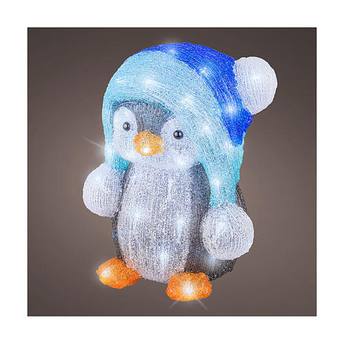 Luminous penguin with Christmas hat 60 LEDs 25x25x30 cm. Bright colored acrylic penguin with blue hat. Ideal as a Christmas decoration, it features 60 LEDs, and is suitable for both indoor and outdoor environments. Measuring 33 cm high, 27 cm wide and 24.5 cm deep, it contains a timer capable of keeping the light on for 8 consecutive hours, at the end of which the 60 LEDs turn off automatically and then turn back on after 16 hours. The product has IP-44 protection, i.e. against both dust and wat...
