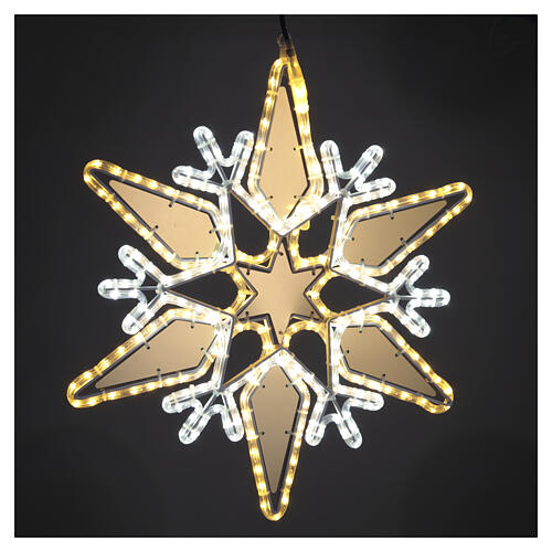 LED Christmas star light figure in white, 80x70 cm. Two-dimensional star-profile structure with a radial luminous design: central section with gold-effect inserts illuminated by warm white light and a contour in cool white LEDs. The top point is fitted with a fixing ring. Suitable for indoor seasonal decorations, wall displays and shop windows. Lighting system with a non-extendable, non-programmable electric power supply; primary voltage 220-240 V 50 Hz, power 21 W. Actual dimensions: height 80 cm, width 70 cm.