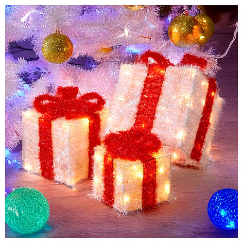 Christmas LED light in the shape of three gift boxes of different sizes, suitable for indoor use. The gift boxes are white and warm white, adorned with bright red ribbons and bows. The set includes three packs measuring 20, 25, and 30 cm in height respectively, each square-shaped with dimensions of 15x15 cm, 20x20 cm, and 25x25 cm. Powered by 3 AA batteries, the light set comes with a 100 cm transparent cable and an IP-20 EU transformer.