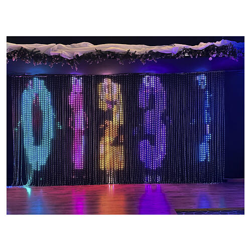 Majestic light curtain enriched with 7200 RGB LED lights, with a height of 3mt and a width of 6mt, 5mt power cable. This professional-grade LED light curtain acts as a true display, offering intense and customizable illumination for any event, from Christmas festivities to weddings and special occasions. With smart connectivity, control is literally at your fingertips through the Superpix application, where you can choose from preloaded animations, draw by hand, or set a scrolling text. Perfect for squares, avenues, events, and historic centers. Technical Details: Primary voltage: 220-240V 50 Hz. Secondary voltage: 5V 300W. Lamp: 5V 0.06W 7200 LED TOT 300W. IP44 protection rating and insulation class: Class 3. Replaceable lamps. Power cable: 5m. Height and length: 3x6m. Bluetooth 4.2. For indoor and outdoor use. Programmable: yes. Not extendable.