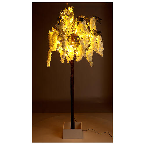 White flowered LED tree of 200x90x90 cm with 96 warm white LED lights, for outdoor and indoor use.A 240 V - 500 mA transformer is included in the package. The cable measures 3 meters.