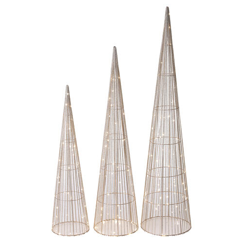 Set of 3 decorative Christmas trees with warm LED lights in sizes 80, 100 and 120 cm. Conical structures made from a gold-colored metal frame with light strings distributed over the entire surface to create points of light and a festive atmosphere. Ideal for home decorations: beside the main tree, near the fireplace, in a shop window or in dedicated festive corners. Battery-operated, requiring 9 AA batteries in total (3 AA per tree) to power the LEDs (batteries not included). Actual dimensions: 80x22 cm, 100x24 cm, 120x28 cm.