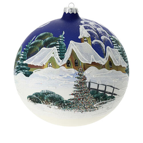 Blown glass ball with nordic winter scenery and blue sky 15 cm. Christmas ball hand blown and finely painted and decorated by hand with a winter scenery and glitter. Precious craftsmenship made in Poland by a company well know for the production of Christmas tree ornaments