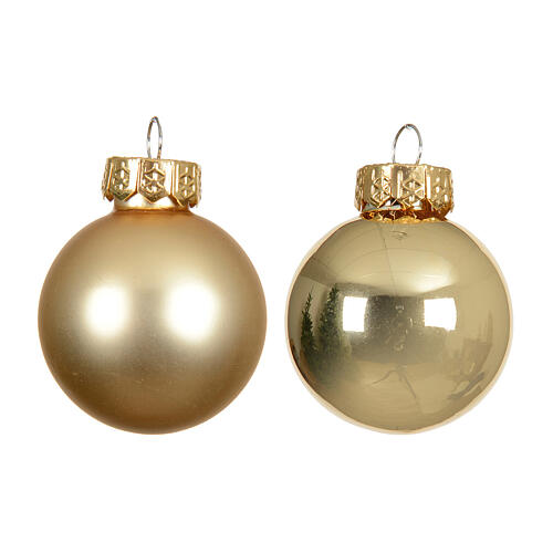 Box of 16 gold glass balls glossy and matte finish, 3.5 cm in diameter. This set includes refined Christmas ornaments with a sophisticated combination of matte and glossy textures. Each Christmas ball comes with a golden metal cap for easy hanging on a tree, at home, or in an office. Packaged in an eco-friendly cardboard box without plastic, respecting the environment, using at least 30% recycled glass.