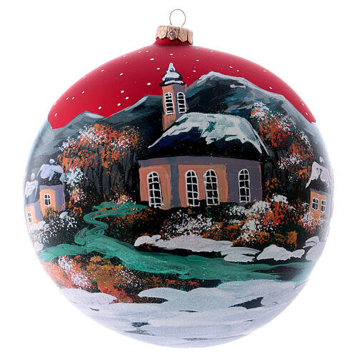 Christmas Ornament 200 mm Nordic Country snow-covered red sky blown glass. The Christmas ball ornament is hand made and painted. It depicts a typical Nordic country with a red sky. The Christmas tree decoration is a handmade from a Polish company. Once the sphere has been created using the blown glass technique, the artisans hand decorate it using different techniques and professional tools. The balls will never be identical because each piece is unique.