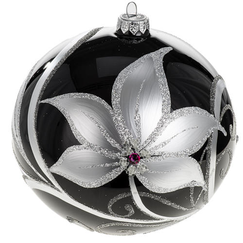 Christmas tree baubles glass black silver flowers, 15cm. The bauble is made of black glass and decorated with silver flowers.