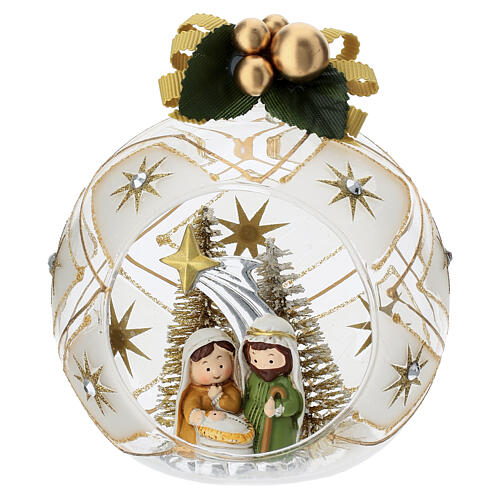 Golden Holy Family Christmas Ball, 10cm Bagutta. This refined, detailed Christmas ball ornament is perfect for bringing joy to the holiday season. The decoration features a transparent and glossy shell enclosing a warm and precious Nativity scene. At the center, the Holy Family is depicted with Mary in an ochre dress and Joseph in a sage green robe, kneeling next to the Child, under a stylized arch resembling a manger and a golden comet star. The setting is enhanced by miniature gold-dusted fir ...