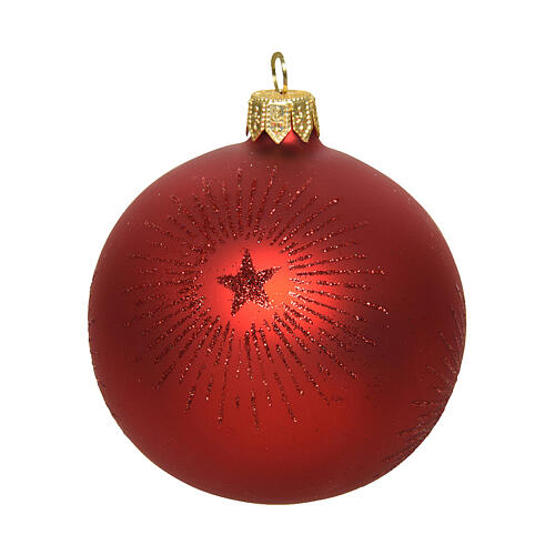 Red blown glass Christmas bauble with glitter star decorations 80mm.Christmas bauble in red blown glass, diameter 8 cm.This Christmas tree bauble was made in Poland by skilled craftsmen with great experience in creating blown glass tree ornaments. The decorations are made with tone-on-tone red glitter. The gift box made of 100% recycled cardboard and transparent PET window is included.High quality handcrafted product.