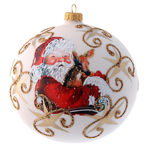 White opaque Christmas tree ball with Father Christmas and deer sized 150 mm. This blown glass Christmas decoration is ideal to decorate the tree or the house and it is made according to the traditional technique. The ball is then hand painted. Every product is different from another: this is what makes these Christmas balls unique.