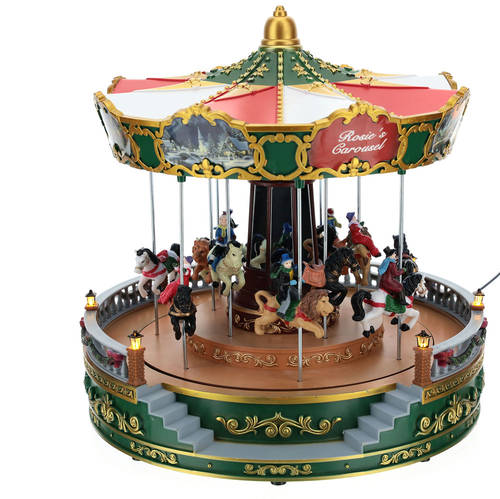 The Christmas village carousel is rich of of details and depicts different animals moving. The entirely carousel is lighted and decorated from top to bottom. It has two modes of operation: lights + movement + music OR music. The carousel decoration is suitable for any type of environment and is compatible with winter villages of the same style (for example MyVillage and Lemax villages). The Christmas carousel is electric powered, comes with a 220V European socket.