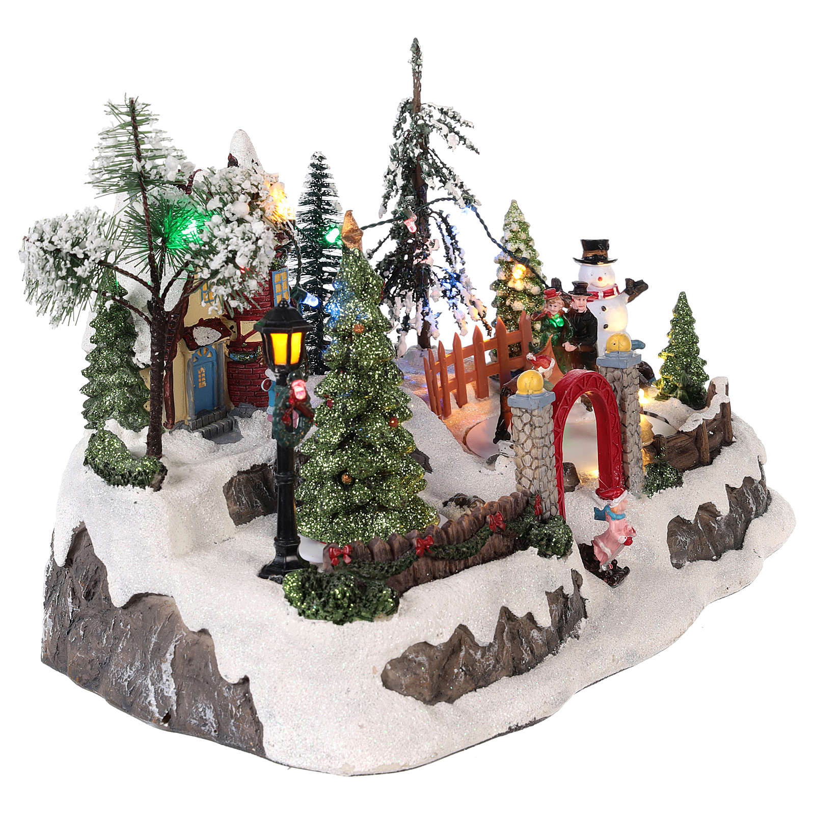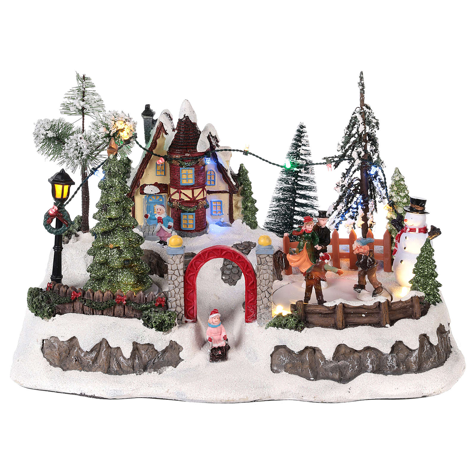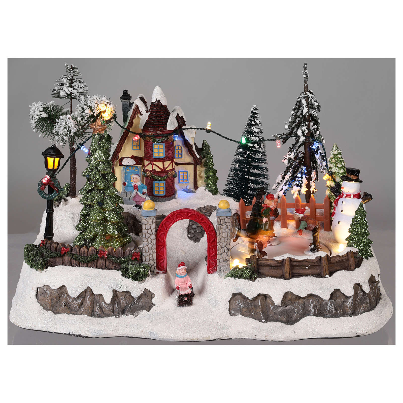 The setting depicts: an ice rink with children in motion, a small house and animated Christmas tree. The Christmas village has lights and music.The switch, depending on the side in which it is positioned, can have two possible functions: lights + movement or lights + music + movement. Works with AA batteries.