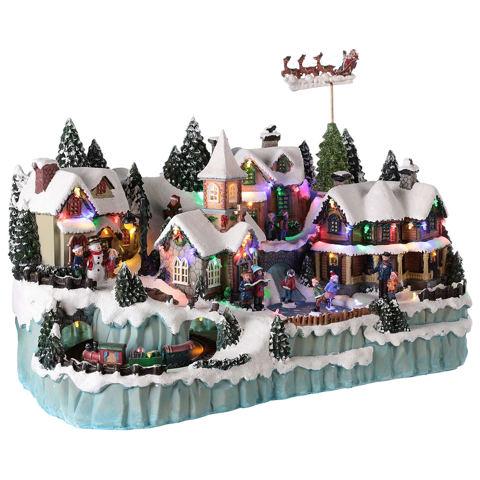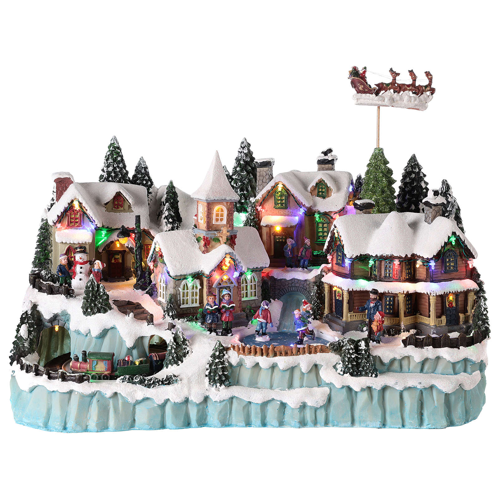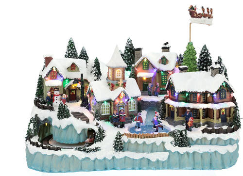 The illuminated and snowy winter village depicts a town with Santa's sled, train and skating rink in movement.