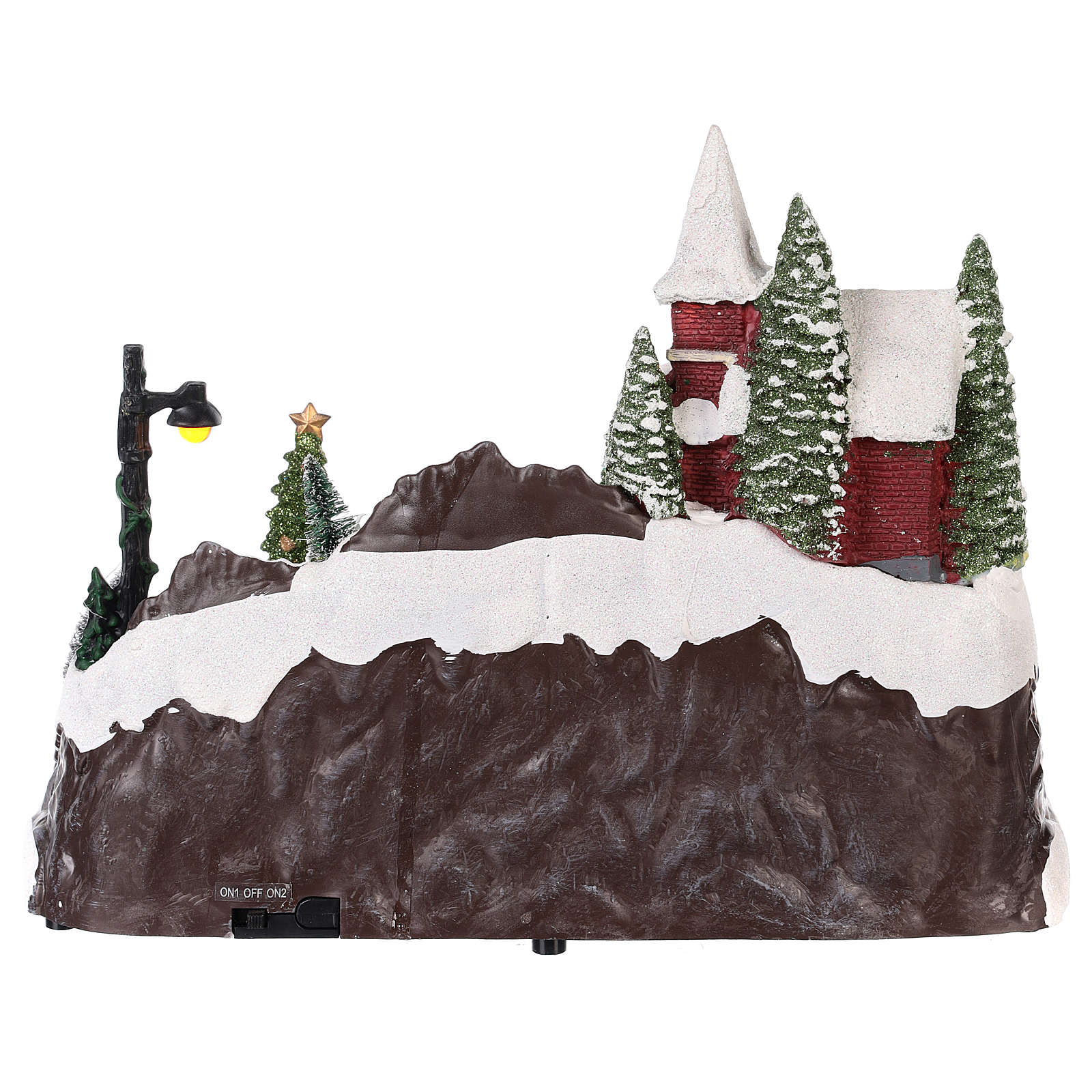 The Christmas village, made of resin has kids moving, a lighted river with fiber optic colored lights and glitter. Works with AA batteries.