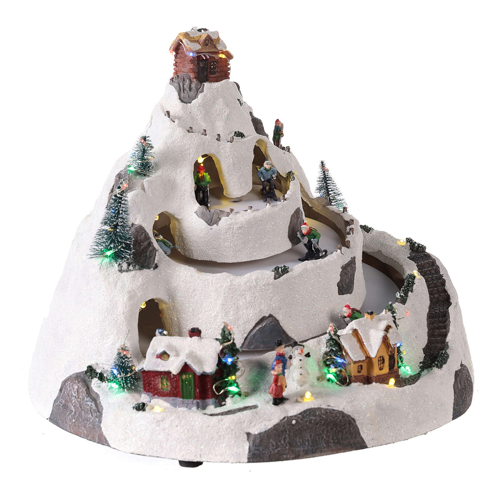 Mountain Christmas village with skiers moving 30x30x25 cm.