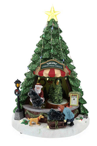 Christmas village made entirely of resin 34x22 cm, with Santa Claus inside a tree shop.The switch, depending on the side in which it is positioned, has two possible functions: lights + movement or lights + music + movement.It is suitable for any type of environment and is compatible with villages of the same style (for example MyVillage and Lemax villages). It works both with electric current with a 220 V European socket transformer (A10 electrical socket) and AA batteries included.