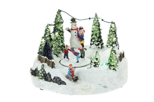 Christmas has children doing typical winter activities such as; ice skating, building a snow man and sledding. The Christmas landscape is made of resin.