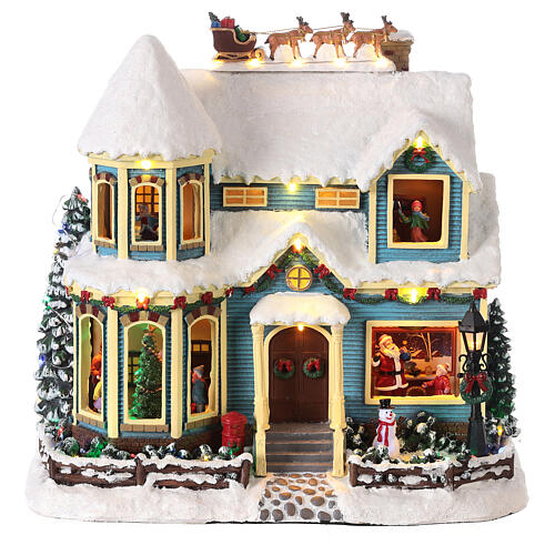 Christmas scene representing a house illuminated by LED lights, on the roof, there's a Santa's sleigh. Measures 33x34x20 cm.From the windows of the houses you can see some characters a tree decorated in movement, all illuminated by LED lights.The village has two switching modes, the first allows you to start the music, movement and lights, the second instead excludes the audio keeping only the movement and lights.The scenario is powered by both AA batteries not included in the package and by electricity and is delivered with a 240V European plug transformer.Christmas house decoration compatible with any accessory and village of the same style, such as Lemax and MyVillage products.