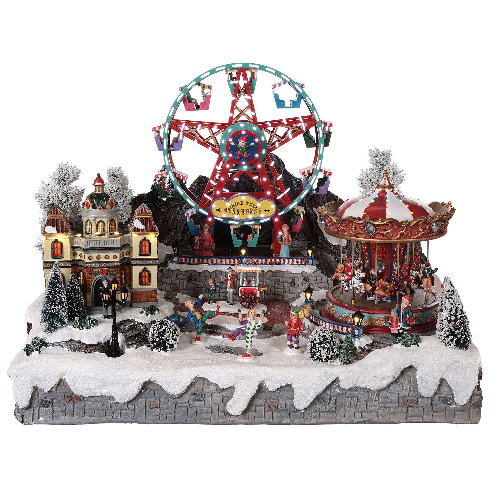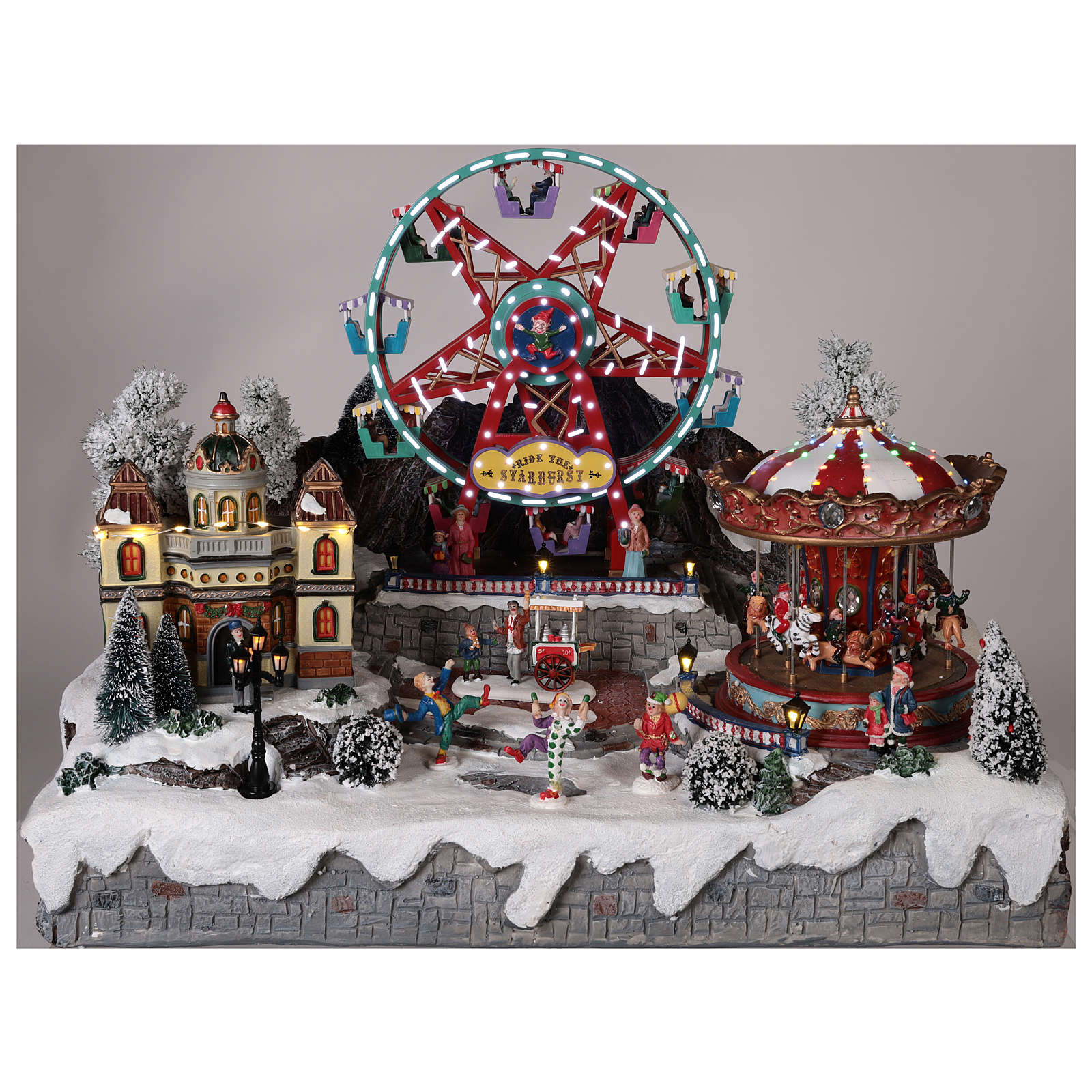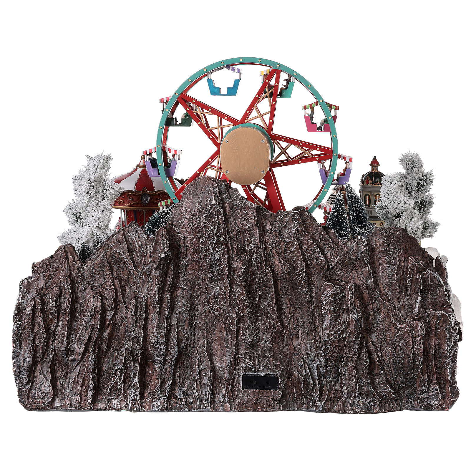 The Christmas village has a working ferris wheel with lights in the center and a horse carousel on the right. This Christmas village is equipped with a European 220V socket and a lever with three functions, when the lever is in the center the village is off, with the lever is on the right the village turns on, with the lever on the left a Christmas tune is played.