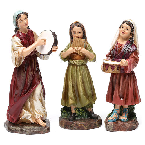 The three resin statues depict musicians playing: tambourine,pan flute an drums. Ideal for a nativity of 20 cm.