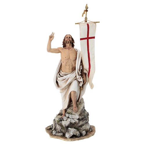Risen Jesus Angela Tripi terracotta 30 cm. Christian statue of the risen Jesus, 30 cm high, made of terracotta and fabric in Italy by Angela Tripi. Each character in Angela Tripi's nativity scene is characterized by a great wealth of details, attention to physiognomy and quality clothes. While the terracotta statues of the traditional nativity scene are generally built on a skeleton covered with clothes, to which are added the extremities of the limbs such as hands, feet and head, Angela Tripi's statues are modeled entirely with a complete body, sculpted naked, and subsequently dressed. Details such as tense muscles, tendons, expression lines, open and defined fingers often emerge clearly.