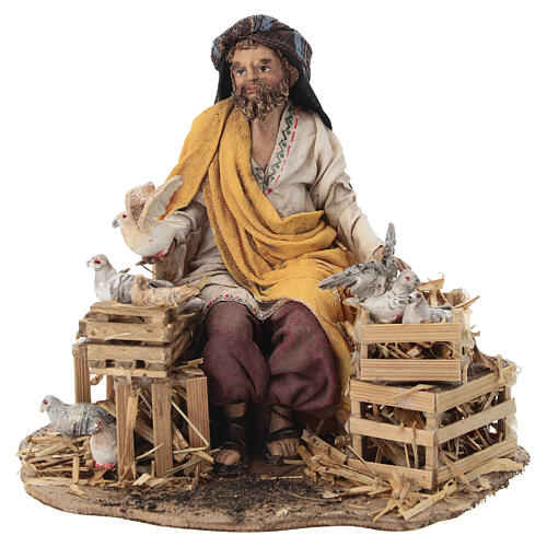 Sitting man with doves 13cm, Nativity Scene by Angela Tripi. Nativity scene figurine made by the Italian artist Angela Tripi suitable for a Nativity Scene with characters 13cm tall.
