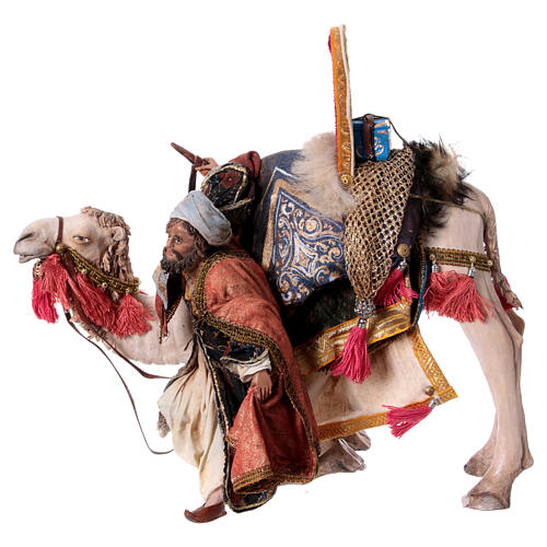 The camel with his eyes half-closed due to the fatigue of the long journey knelt down to help the Magi get off his back and reach the cave of the Savior. The Wise King still clinging to the armchair with one hand has his eyes turned upward and his mouth almost ajar as a sign of amazement. He has finally reached his goal, he is tired and exhausted but the wonder that awaits him will vanish his fatigue.