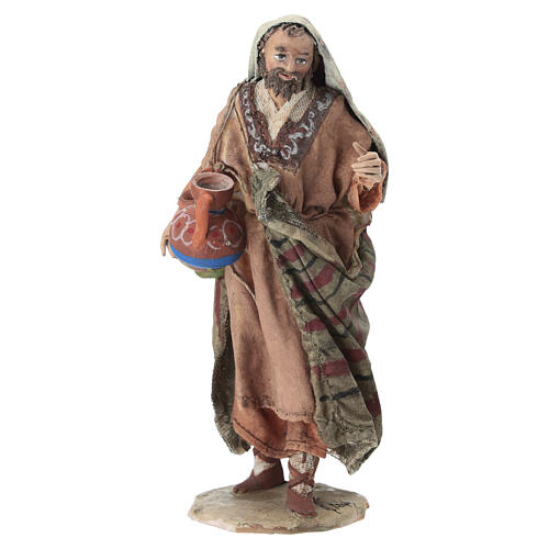 Wayfarer with amphorae 13 cm Angela Tripi. The traveler advances along the village paths with steady steps and a gaze full of lived experience. He carries two amphorae on his shoulders while a third is held under his arm; signs of a long journey of encounters, toil and stories kept in silence. Now his path leads him to the Savior's stable, the final destination of a pilgrimage that seems to sum up the meaning of his life. The Nativity Scene tradition of the atelier Angela Tripi is distinguished by meticulous attention to detail and a rich narrative quality. Today the artists working in the atelier continue this precious creative heritage, shaping each figure through careful modelling of terracotta and a skilled use of fabrics, producing intense characters with realistic, deeply expressive faces capable of conveying authentic emotion. Each nativity statue is created as a unique, unrepeatable piece, the result of study, research and artistic sensitivity. The creations preserve a recognizable and coherent vision, transforming every Nativity figure into a true work of art full of expressiveness. Tripi's atelier draws inspiration from the ancient Arab world, reworking its atmospheres and suggestions in harmony with a distinctly Italian tradition: hand-modelled terracotta and the art of the nativity. A notable technical feature is that the bodies are modeled entirely, nude, and then dressed, unlike traditional figures built on a skeleton.