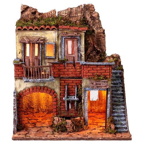 Antique village with 18th-century style fountain 45x40x30 cm Neapolitan nativity scene 10-12 cm. This antique village for nativity scene is a masterpiece crafted by skilled Neapolitan artisans. It depicts the entrance of a house accessible via an external staircase, flanked by two recesses suitable for 10-12 cm statues, perfect for daily life scenes. In the center between the recesses, there is a fountain that can be activated by filling the dedicated tray at the back. Distinctive elements such as balconies and window shutters have been finely crafted to resemble real structures accurately, adding uniqueness and originality to the model. This nativity scene village is perfect to enhance any nativity style with a fully artisanal piece. Real measurements: 44x40x30 cm. Made in Italy.