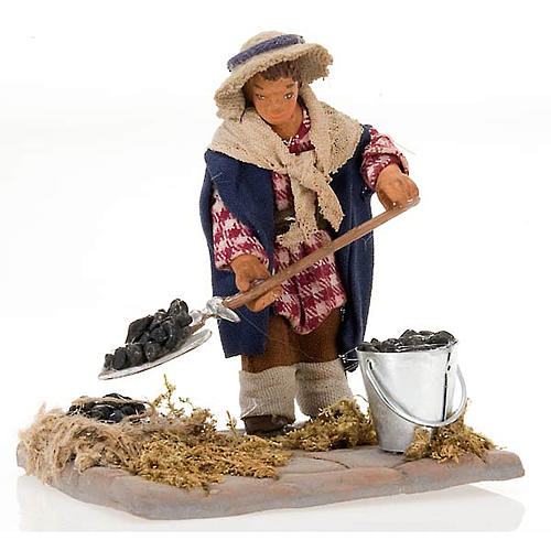 Charcoal burner for nativity scene: figurine made of terracotta typical of the Neapolitan nativity scene. This statue depicts a man on a base working with a shovel and mooving coal.