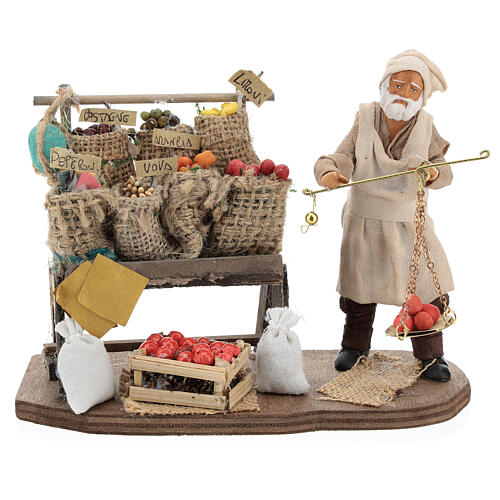 Greengrocer with stand and scale for 13 cm nativity. Greengrocer figurine display stand with sacks of oranges, peppers, eggs, with the greengrocer alongside holding a scale while weighing apples. The setting is suitable for 13 cm nativity sets.