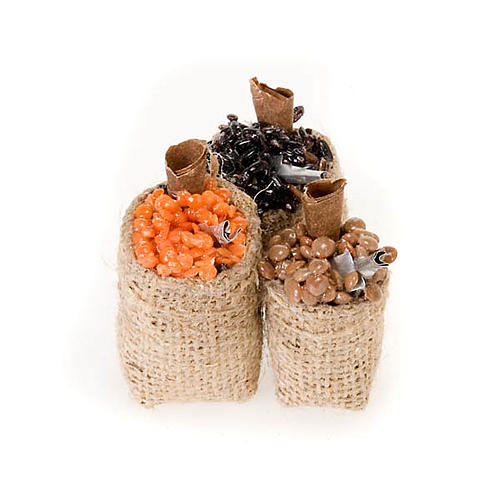 Nativity scene accessory jute sack with food in terracotta. Jute sack with food miniatures for Neapolitan nativity scene. Small decorations hand-made in Naples, Italy. The sack is made of real jute, while the food miniatures are in painted terracotta. Sold individually and delivered as per color availability.