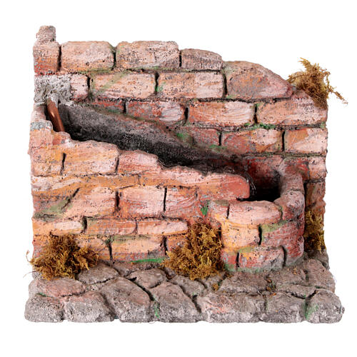 Functional downstream fountain figurine for Neapolitan nativity scene, painted and handmade by expert Neapolitan nativity craftsmen. The fountain features a tap that pours water down a small chute, ending in a tiled basin. To operate, first fill the tray with clean water and then connect the 220V European power cable located on the back, activating the motor. Before using it, add water to avoid damage to the pump. Ideal for figurines about 10 cm tall. Dimensions: 13x17.5x14 cm.