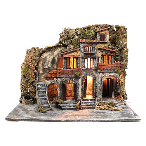Village with a group of houses at the top of a rocky landscape, created in cork. The setting has three wooden doors at the base, suitable for 12 cm statues. Village with lateral stairway, illuminated (220 - 240V) and with a fountain, both with an electric plug. The electric fountain works filling the water container inside it and then connecting the plug. It is made in Italy by specialized Neapolitan artisans.