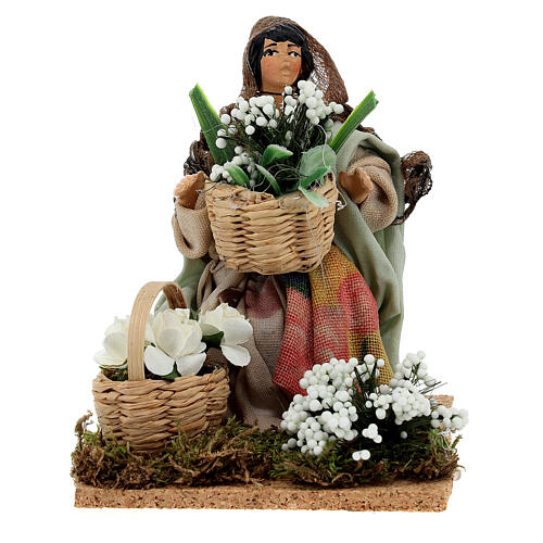 The nativity statue represents a young woman seated surrounded by flower baskets, all on a cork base.This terracotta nativity figurine is unique as it is made handcrafted with fabrics of limited availability.The statue is produced in Naples, Italy, home of the Italian nativity scene tradition.