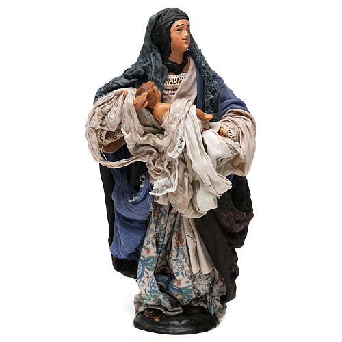 Woman with Child in Arms for 35 cm nativity. Woman with Child in arms is produced from terracotta and dressed with shaped cloths. The statue is hand produced by artisans from Naples, giving care to every detail making this piece realistic and unique.