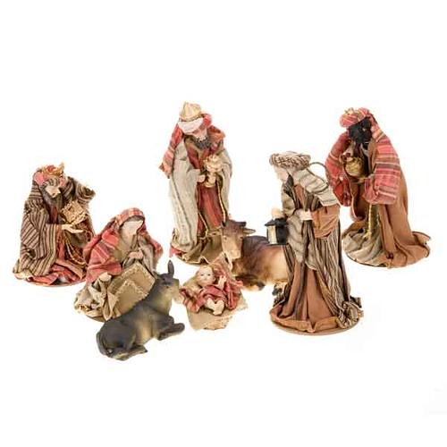 Cotton Nativity scene, 8 characters in resin and cotton 15 cm high. Crib entirely hand-painted with Eastern style colors and decorations.