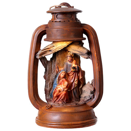 Unique Nativity set within an antiqued-style lantern made of rust-brown resin, adding a vintage and warm touch to the representation. The three main characters of the Holy Family are positioned innovatively and intimately at the center of the lantern, with Mary gently cradling Baby Jesus. A cold white LED light delicately illuminates the scene, creating a welcoming and sacred atmosphere. The lantern is equipped with a cord at the top, allowing you to hang this beautiful Christmas representation ...
