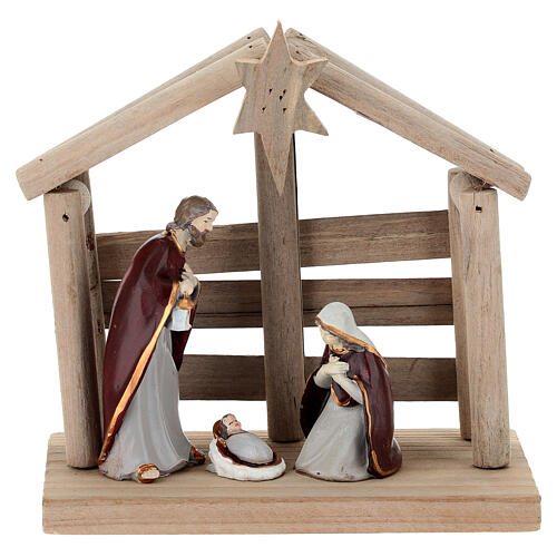 Nativity Holy Family set with wood stable, 15 cm