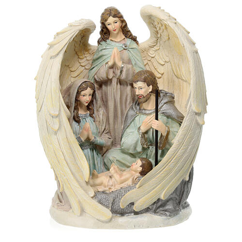 Nativity Scene in Shabby Chic style representing an angel protecting with his wings the whole Holy Family, painted with soft and delicate colors to create harmony and elegance.